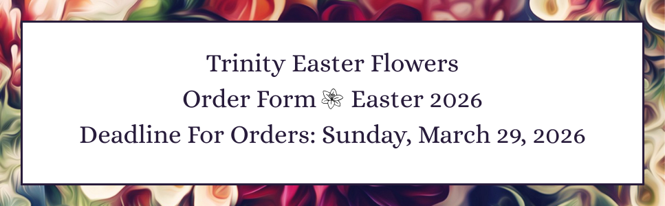 The Trinity Flower Committee thanks you for your help in beautifying our sanctuary. We kindly request a $75 donation to the Flower Committee to cover the cost of flowers and supplies. Checks may be mailed to the Church or dropped in Sunday’s collection plate. The bouquet is yours to take home after the Sunday morning service. To reserve flowers please contact the Church Office.