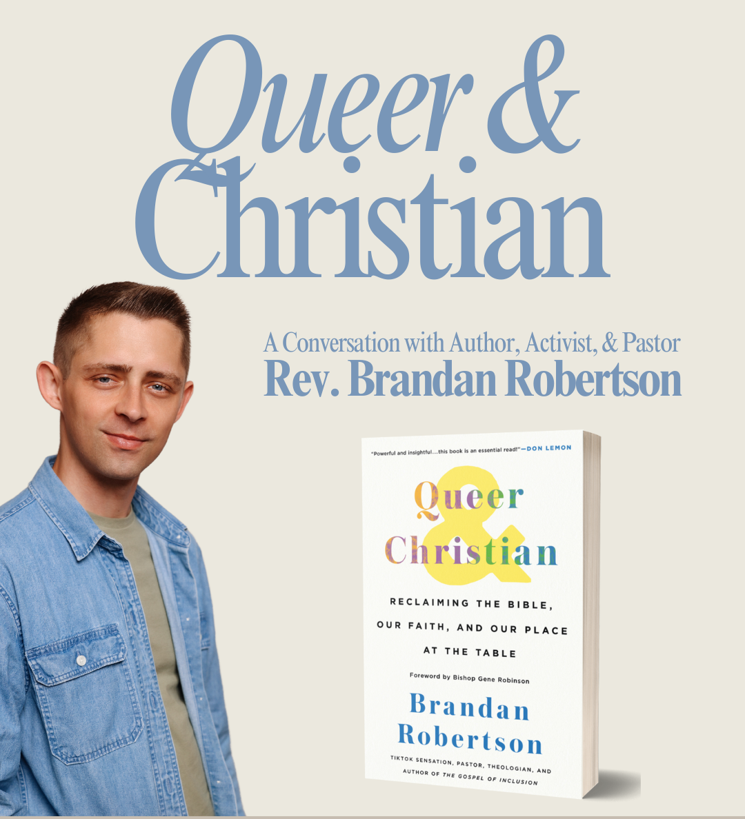 Social Justice Book Forum: The Social Justice Committee invites you to join us for an online book forum featuring author, Rev. Brandan Robertson, to discuss his book, Queer & Christian Reclaiming the Bible, Our Faith, and Our Place at the Table. The 90-minute forum will be held on Tuesday, June 2 at 7 PM via Zoom. His book is available at local libraries, Thriftbooks and Bookshop.org as well as audio versions. Hard copies are available at Trinity Church Office. To learn more Rev. Robertson, his website is brandanrobertson.com. RVSP to Diana Nelson at dianalnelson04@gmail.com for the zoom link.