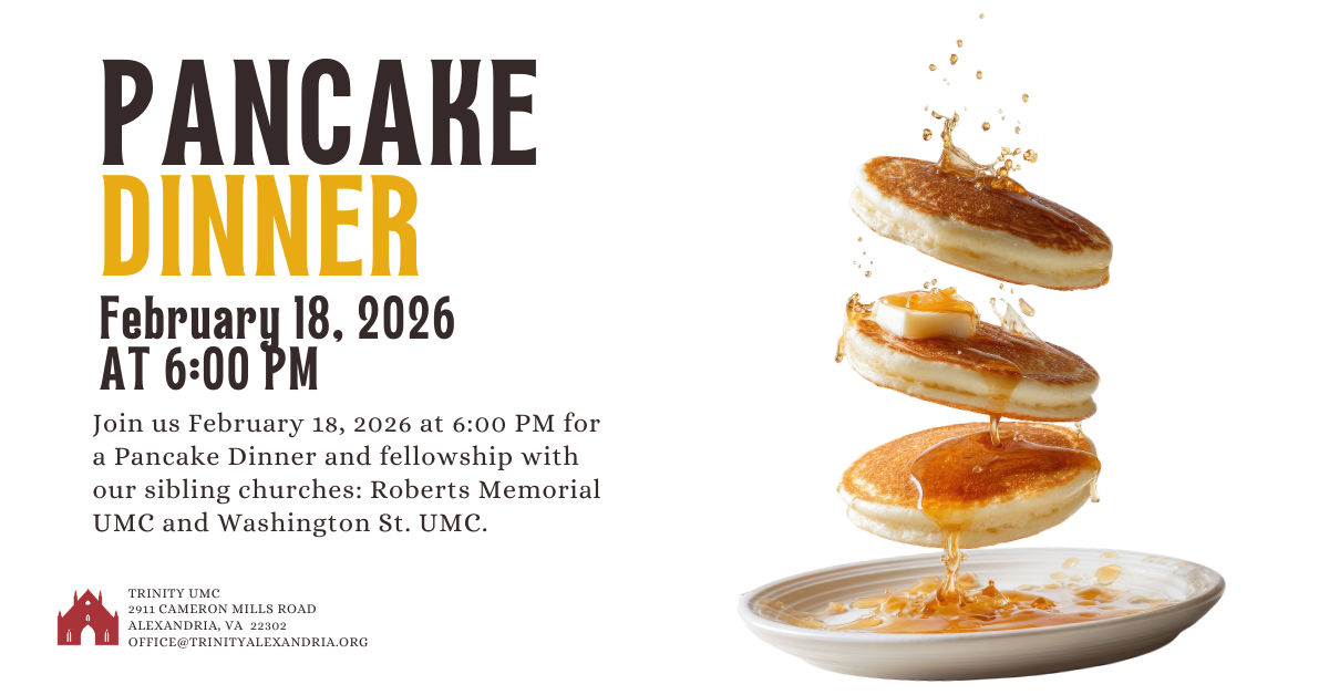 Pancake Dinner Wednesday, February 18, 2026 6:00 PM 7:00 PM Trinity United Methodist Church 2911 Cameron Mills Road Alexandria, VA, 22302 United States (map) Google Calendar ICS RSVP Here