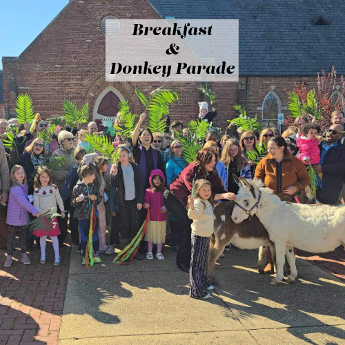 Breakfast & Donkey Parade: The donkeys are back! All are invited next Sunday, March 29, 2026 at 10 AM for breakfast and a Donkey Parade in celebration of Palm Sunday. Bring your favorite breakfast food to share. We will wave palms and streamers, walk with donkeys, and help lead the worship parade processional at 10:30 AM.