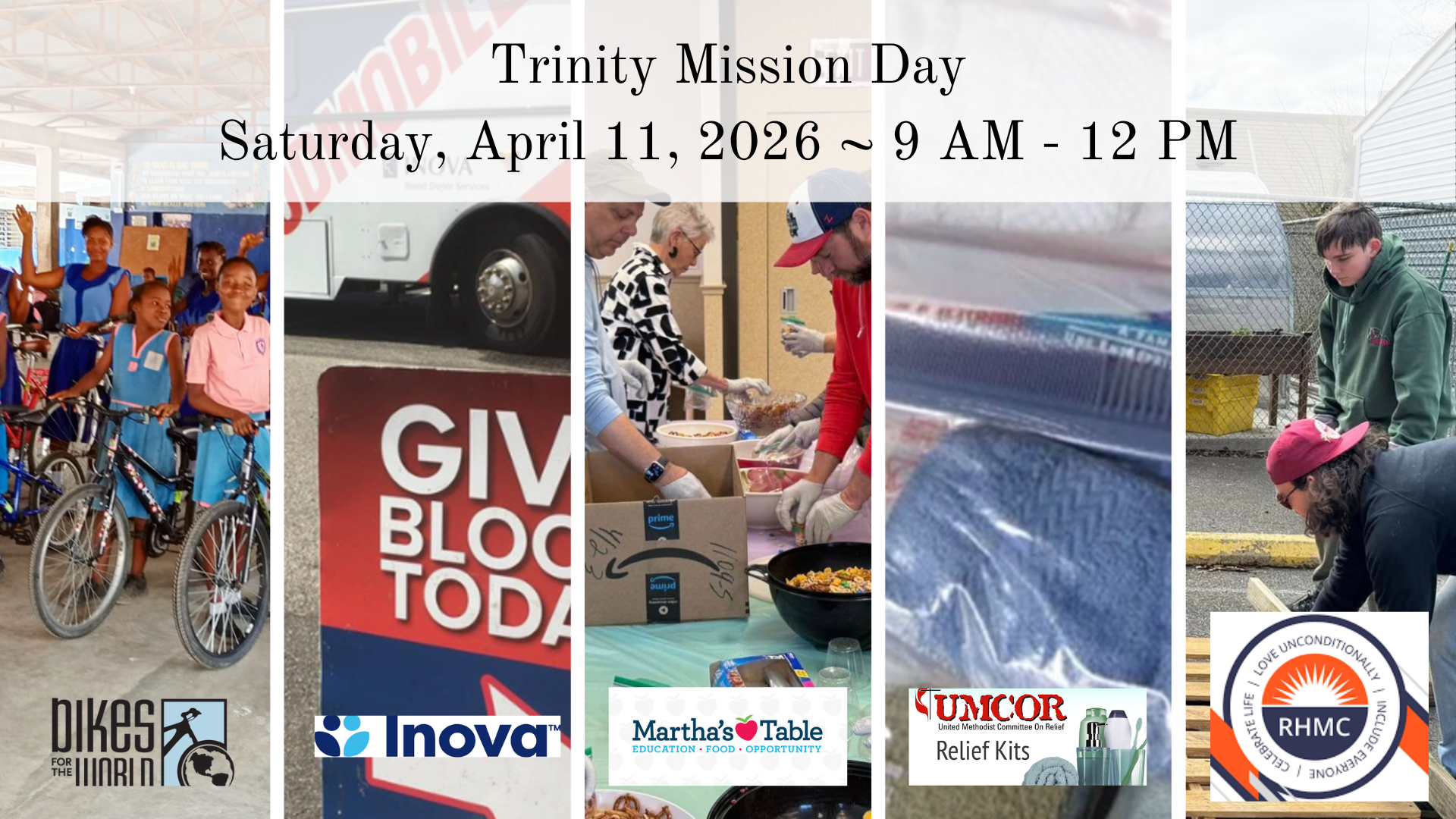Trinity Mission Day, Saturday, April 11th, 9 AM-12PM: Join us for Trinity Church’s annual Mission Day as we come together to serve our community and beyond. All ages are invited to participate in a variety of hands-on projects, including supporting Bikes for the World, donating at the Inova Blood Drive, preparing sandwiches and trail mix for Martha’s Table, assembling hygiene kits for UMCOR, collecting children’s books for ACPS and helping at Rising Hope. Come for an hour or stay for the morning - your participation makes a difference! Don’t forget to bring a children’s book for the book drive and a loaf of whole wheat bread and 1.25 lbs of turkey or roast beef and 0.75 lbs of sliced cheese. Questions? Contact Julie McKinney or see Kari Webber after worship!